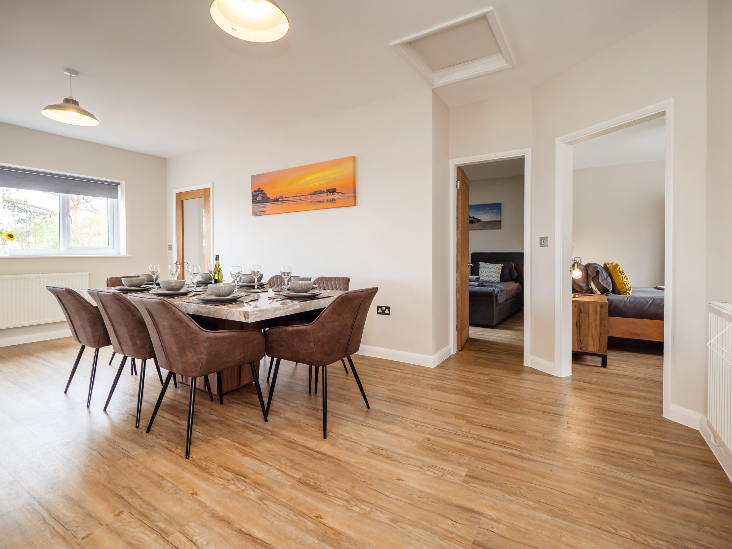 This beautifully positioned hilltop holiday home in Cromer offers spacious, light-filled living with breathtaking panoramic views over the sea and town. The lounge features bi-fold doors, ample seating for eight, and a large Smart TV—perfect for relaxing after a day by the coast.